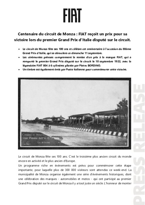 Le circuit de Monza fête ses 100 ans et célèbre cet anniversaire à l'occasion du 88ème Grand Prix d'Italie, qui se déroulera ce dimanche 11 septembre. Les cérémonies prévues comprennent la remise d'un prix à la marque FIAT, qui a remporté le premier Grand Prix disputé sur le circuit le 10 septembre 1922, avec la légendaire FIAT 804 à 6 cylindres pilotée par Pietro BORDINO. Un timbre est également émis par Poste Italienne pour commémorer cette victoire.