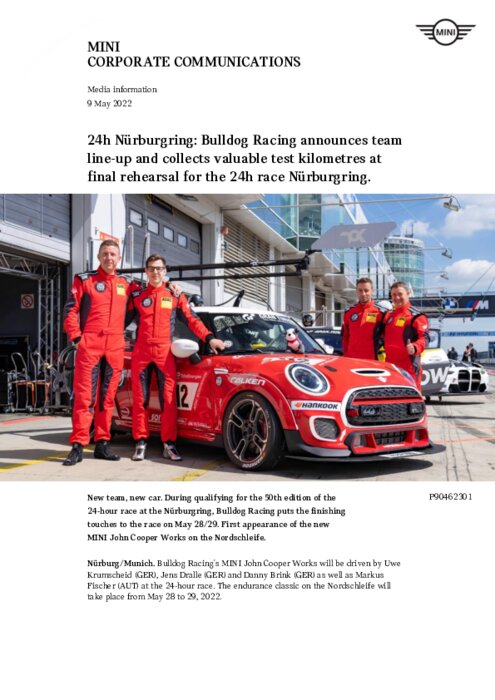 Présentation des pilotes qui prendront le départ de cette 50ème édition. Première apparition de la MINI John Cooper Works Bulldog Racing sur la Nordschleife. Derniers réglages avant le départ de la course qui se déroulera les 28 et 29 mai prochains.