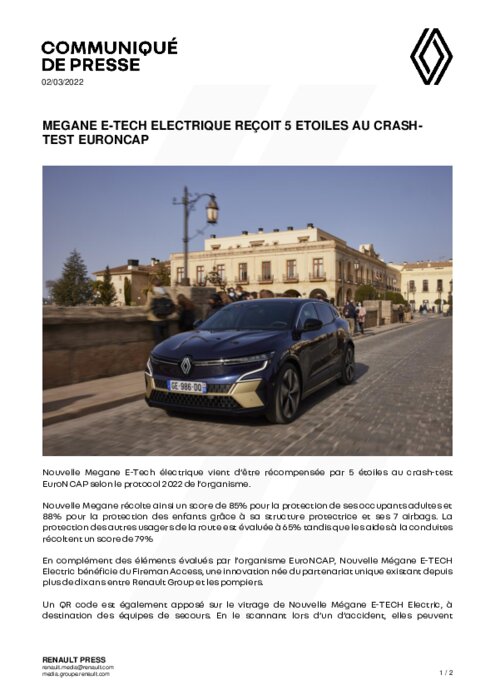 Nouvelle Megane E-Tech électrique vient d’être récompensée par 5 étoiles au crash-test EuroNCAP selon le protocole 2022 de l’organisme. Nouvelle Megane récolte ainsi un score de 85% pour la protection de ses occupants adultes et 88% pour la protection des enfants grâce à sa structure protectrice et ses 7 airbags. La protection des autres usagers de la route est évaluée à 65% tandis que les aides à la conduites récoltent un score de 79%...