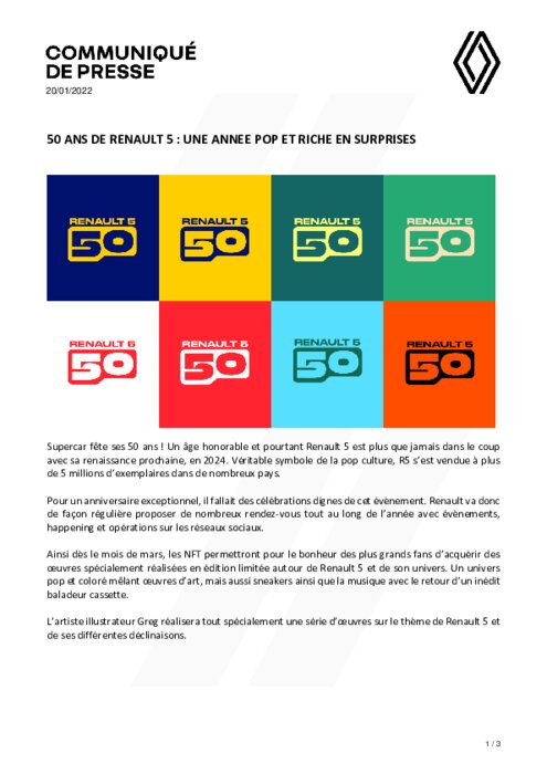 Supercar fête ses 50 ans ! Un âge honorable et pourtant Renault 5 est plus que jamais dans le coup avec sa renaissance prochaine, en 2024. Véritable symbole de la pop culture, R5 s’est vendue à plus de 5 millions d’exemplaires dans de nombreux pays. Pour un anniversaire exceptionnel, il fallait des célébrations dignes de cet évènement. Renault va donc de façon régulière proposer de nombreux rendez-vous tout au long de l’année avec évènements, happening et opérations sur les réseaux sociaux.