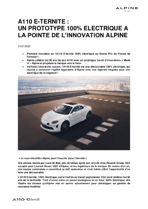 Première mondiale de l’A110 E-ternité 100 % électrique au Grand Prix de France de Formule 1. Alpine célèbre les 60 ans de son A110 avec un prototype, bardé d’innovations « Made in » Alpine et projetant la marque vers le futur. Véritable laboratoire roulant, l’A110 E-ternité est une découvrable 100 % électrique, qui réussit à conserver l’agilité légendaire d’Alpine avec une légèreté inégalée pour une électrique de ce segment !