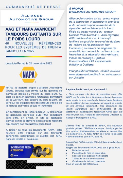 NAPA, la marque propre d’Alliance Automotive Group, annonce son arrivée sur les gammes de Tambours dédiés au marché du poids lourd. Au total, ce sont 34 nouvelles références, permettant de couvrir 80% des besoins du parc roulant, qui sont sur les étagères des distributeurs officiels de la marque en France depuis mi-novembre.