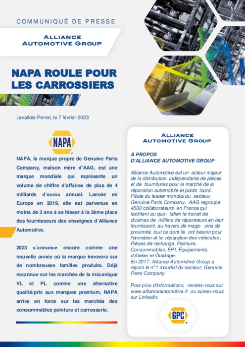 Lancée en Europe en 2019, NAPA est parvenue en moins de 3 ans à se hisser à la 2ème place des fournisseurs des enseignes d’Alliance Automotive. 2023 s’annonce encore comme une nouvelle année où la marque innovera sur de nombreuses familles produits. Déjà reconnue sur les marchés de la mécanique VL et PL comme une alternative qualité/prix aux marques premium, NAPA arrive en force sur les marchés des consommables peinture et carrosserie.