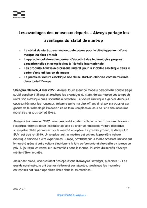 Aiways, fournisseur de mobilité personnelle dont le siège social est situé à Shanghai, explique les avantages du statut de start-up en ces temps de révolution électrique dans l'industrie automobile. La voiture électrique a généré de belles opportunités pour les nouveaux arrivants sur le marché, offrant ainsi aux start-ups et aux géants de la technologie l'occasion de se faire une place au sein de l'une des industries mondiales les plus compétitives.