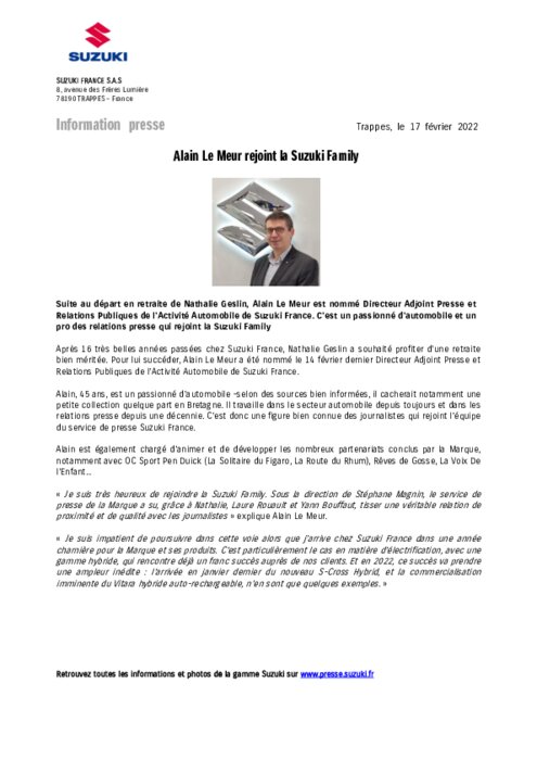 Suite au départ en retraite de Nathalie Geslin, Alain Le Meur est nommé Directeur Adjoint Presse et Relations Publiques de l’Activité Automobile de Suzuki France. C’est un passionné d’automobile et un pro des relations presse qui rejoint la Suzuki Family.