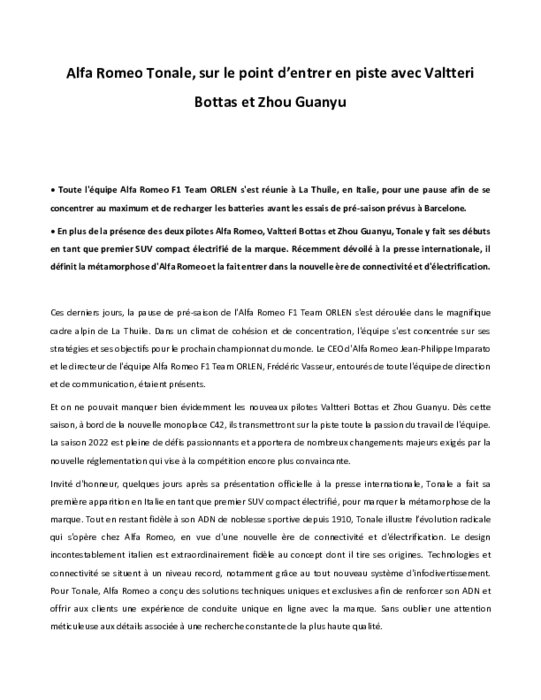 Toute l'équipe Alfa Romeo F1 Team ORLEN s'est réunie à La Thuile, en Italie, pour une pause afin de se concentrer au maximum et de recharger les batteries avant les essais de pré-saison prévus à Barcelone. En plus de la présence des deux pilotes Alfa Romeo, Valtteri Bottas et Zhou Guanyu, Tonale y fait ses débuts en tant que premier SUV compact électrifié de la marque...
