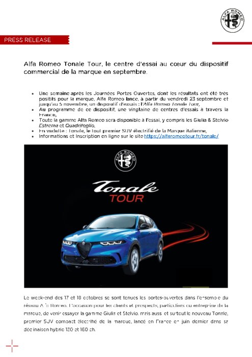 Une semaine après les Journées Portes Ouvertes, dont les résultats ont été très positifs pour la marque, Alfa Romeo lance, à partir du vendredi 23 septembre et jusqu’au 5 novembre, un dispositif d'essais : l’Alfa Romeo Tonale Tour.