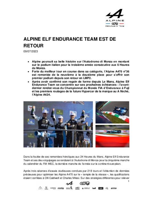Dans la foulée de ses remontées héroïques aux 24 Heures du Mans, Alpine Elf Endurance Team et ses deux équipages se rendaient à l’Autodromo di Monza pour la cinquième manche du calendrier du FIA WEC, la dernière manche de l’année sur le continent européen. Après trois séances d’essais studieuses conclues par 218 tours et l’obtention de données précieuses pour optimiser les Alpine A470 sur le « temple de la vitesse », les qualifications étaient confiées à Olli Caldwell et Charles Milesi.
