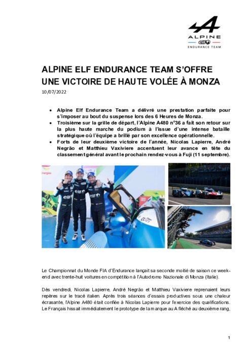 Alpine Elf Endurance Team a délivré une prestation parfaite pour s’imposer au bout du suspense lors des 6 Heures de Monza. Troisième sur la grille de départ, l’Alpine A480 n°36 a fait son retour sur la plus haute marche du podium à l’issue d’une intense bataille stratégique où l’équipe a brillé par son excellence opérationnelle. Forts de leur deuxième victoire de l’année, Nicolas Lapierre, André Negrão et Matthieu Vaxiviere accentuent leur avance en tête du classement général.