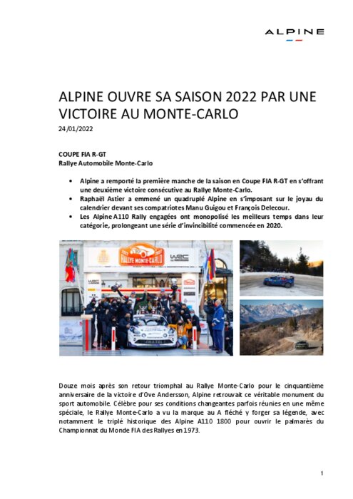 Alpine ouvre sa saison 2022 par une victoire au Monte-Carlo