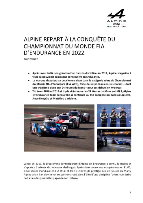 Alpine repart à la conquête du Championnat du Monde FIA d'Endurance en 2022