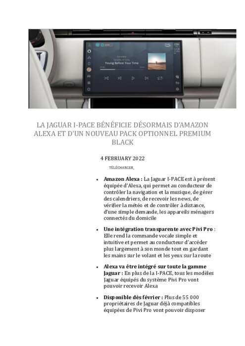 Constructeurs 04 février 2022 - 16:22 La Jaguar I-PACE dispose à présent d’une technologie plus que jamais axée sur le conducteur ainsi que de nouvelles options pour rehausser son design maintes fois primé. PDF (196 Ko) Télécharger