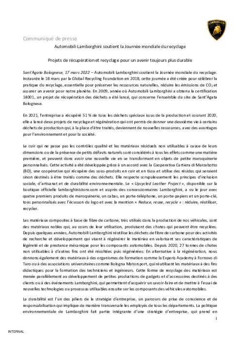 Automobili Lamborghini soutient la Journée mondiale du recyclage. Instaurée le 18 mars par la Global Recycling Foundation en 2018, cette journée a été créée pour célébrer la pratique du recyclage, essentielle pour préserver les ressources naturelles, réduire les émissions de CO2 et assurer un avenir pour notre planète. En 2009, année où Automobili Lamborghini a obtenu la certification 14001, un projet de récupération des déchets a été lancé...