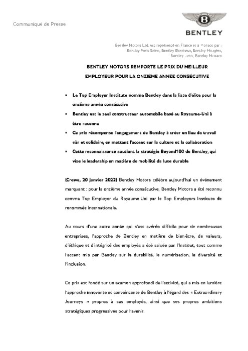 Bentley célèbre une étape importante, après avoir été reconnu pour la 11è année consécutive comme l'un des meilleurs employeurs du Royaume-Uni par l'Institut des meilleurs employeurs. Au cours d'une autre année qui s'est avérée difficile pour de nombreuses organisations, l'Institut a salué l'approche de Bentley en matière de bien-être, de valeurs, d'éthique et d'intégrité des employés, ainsi que l'accent mis par Bentley sur la durabilité, la numérisation, la diversité et l'inclusion...