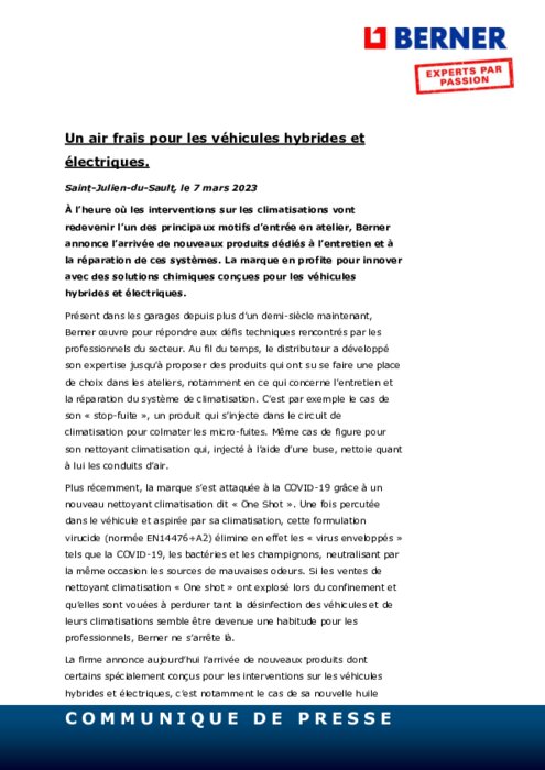 Berner : Un air frais pour les véhicules hybrides et électriques