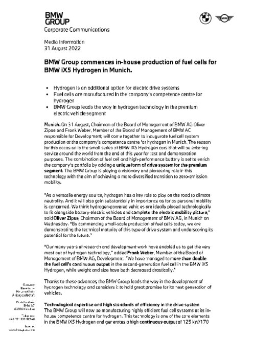 Sur ce créneau, BMW estime jouer un rôle "pionnier", en raison notamment de sa coopération depuis 2013 avec le japonais Toyota, premier constructeur mondial et l'un des plus avancés sur la motorisation hydrogène.
