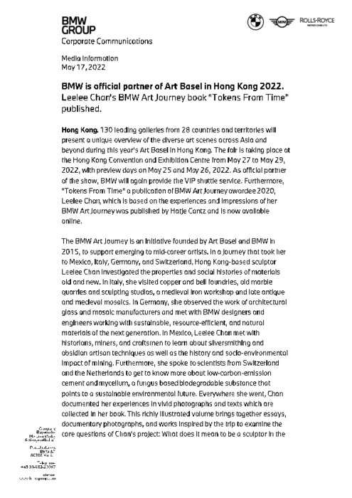 130 galeries de renom provenant de 28 pays et territoires présenteront un aperçu unique des diverses scènes artistiques d'Asie et d'ailleurs lors de l'édition de cette année d'Art Basel à Hong Kong. La foire se tiendra au Hong Kong Convention and Exhibition Centre du 27 au 29 mai 2022, avec des journées avant-première les 25 et 26 mai 2022. En tant que Partenaire Officiel, BMW fournira à nouveau le service de shuttle VIP.