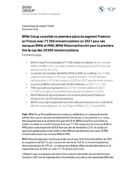 BMW Group France démontre à nouveau sa solidité dans un contexte de marché difficile. Alors que le marché automobile termine l’année pour la seconde fois à un niveau historiquement bas et se contente d’un gain de 0,5 %, BMW Group France confirme sa position de leader du marché Premium local avec 71 306 ventes pour les marques BMW et MINI grâce à une progression de 5,9 % et une part de marché de 4,3 %. Un succès qui repose en grande partie sur les modèles électrifiés...