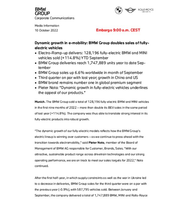 BMW Group a vendu un total de 128 196 véhicules BMW et MINI entièrement électriques au cours des neuf premiers mois de 2022, doublant ainsi ses ventes de BEV par rapport à la même période de l'année précédente (+114,8 %). L'entreprise a ainsi pu transformer le fort intérêt pour ses produits entièrement électriques en une croissance robuste.