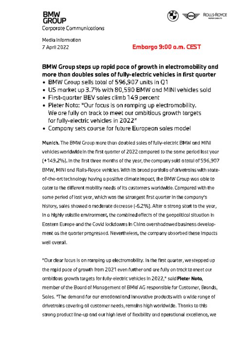 Le marché américain progresse de 3,7 % avec 80 590 véhicules BMW et MINI vendus. Au premier trimestre, les ventes de véhicules électriques progressent de 149 %. Pieter Nota : "Nous nous concentrons sur le développement de l'électromobilité. Nous sommes sur la bonne voie pour atteindre nos ambitieux objectifs de croissance pour les véhicules entièrement électriques en 2022". L'entreprise met en place le futur modèle de ventes européen.