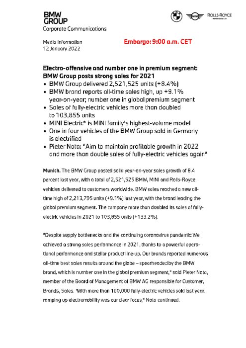 BMW Group a livré 2 521 525 unités (+8,4%). La marque BMW enregistre des ventes record, en hausse de +9,1%. Sur un an, numéro un du segment premium mondial. Les ventes de véhicules entièrement électriques ont plus que doublé pour atteindre 103 855 unités. La MINI électrique est le modèle le plus vendu de la famille MINI. Pieter Nota : notre objectif est de maintenir une croissance rentable en 2022 et de faire plus que doubler les ventes de véhicules entièrement électriques.