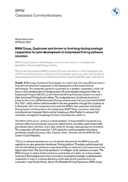 BMW Group, Qualcomm Technologies et Arriver unissent leurs forces pour co-développer la prochaine génération de systèmes de conduite automatisée. Cette coopération combine la pile AD actuelle de BMW avec les produits Vision Perception et NCAP Drive Policy d'Arriver sur le "system-on-chip" (SoC) de Qualcomm Technologies, dans le but de concevoir les meilleures fonctionnalités de conduite automatisée de leur secteur, couvrant les niveaux NCAP, 2 et 3.