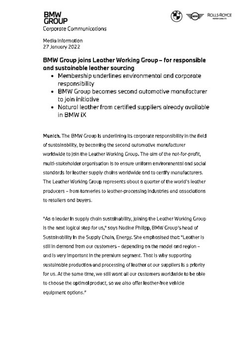 Le groupe BMW souligne sa responsabilité d'entreprise dans le domaine de la durabilité en devenant le deuxième constructeur automobile au monde à rejoindre le Leather Working Group. L'objectif de cette organisation multipartite à but non lucratif est de garantir des normes environnementales et sociales uniformes pour les chaînes d'approvisionnement en cuir dans le monde entier et de certifier les fabricants. Le Leather Working Group représente environ 1/4 des producteurs de cuir dans le monde...