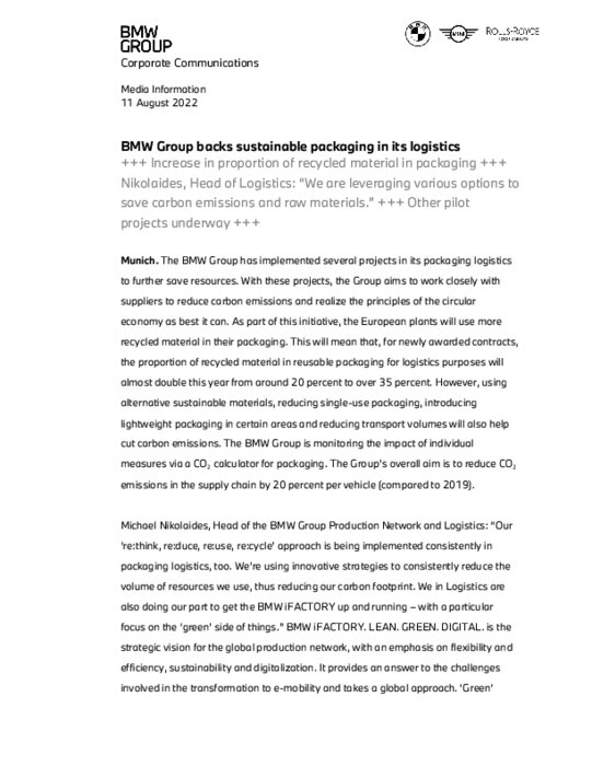 Le groupe BMW Augmente la proportion de matériaux recyclés dans les emballages. Michael Nikolaides, responsable de la logistique : « Nous mettons en place différentes solutions pour réduire les émissions de carbone et les besoins en matières premières ». Autres projets pilotes en cours