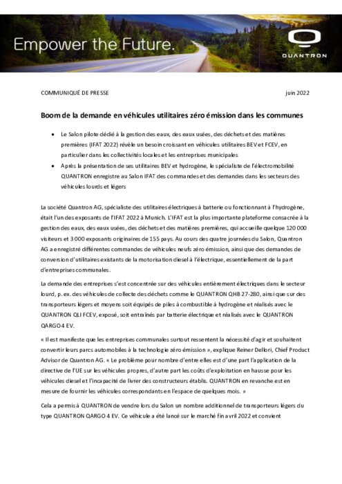 Le Salon pilote dédié à la gestion des eaux, des eaux usées, des déchets et des matières premières (IFAT 2022) révèle un besoin croissant en véhicules utilitaires BEV et FCEV, en particulier dans les collectivités locales et les entreprises municipales. Après la présentation de ses utilitaires BEV et hydrogène, le spécialiste de l’électromobilité QUANTRON enregistre au Salon IFAT des commandes et des demandes dans les secteurs des véhicules lourds et légers.