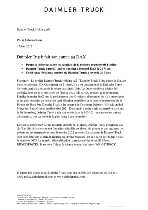 L'activité automobile, qui s'appelle désormais Mercedes-Benz, est déjà membre du Dax, au même titre que les constructeurs BMW et Volkswagen.