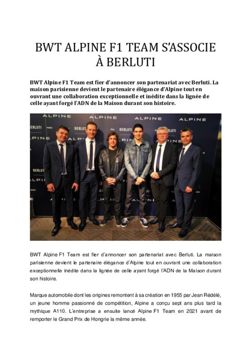 BWT Alpine F1 team s'associe à Berluti