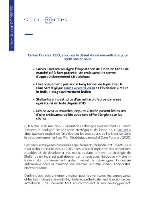 Carlos Tavares souligne l’importance de l’Inde en tant que marché clé à fort potentiel de croissance et centre d’approvisionnement stratégique. Un engagement pris sur le long terme, en ligne avec le Plan Stratégique Dare Forward 2030 et l’initiative « Make in India » du gouvernement indien. Stellantis a investi plus d’un milliard d’euros dans ses opérations en Inde depuis 2015.