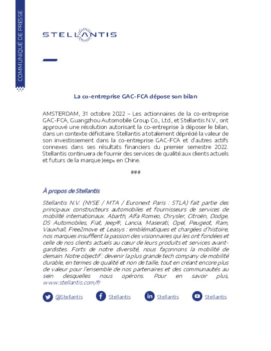 Stellantis et Guangzhou Automobile Group Co (GAC) ont "approuvé une résolution autorisant [leur] coentreprise à déposer le bilan", a indiqué dans un communiqué le groupe aux 14 marques, évoquant un "contexte déficitaire".