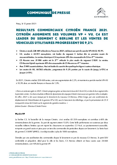 En 2021, Citroën a réalisé 228 469 ventes, soit une augmentation de 2,2%, et maintient sa part de marché VP+VU à 10,9% dans un marché français en hausse de 1,9%. « Dans un contexte agité en 2021, Citroën progresse grâce au lancement réussi de C4 et ë-C4, en tête de leur segment dès la première année. Ces bons résultats reflètent le dynamisme des équipes Citroën mais aussi une gamme riche et adaptée. En effet, 2021 a été aussi marqué par le lancement du nouveau C3 Aircross, d’Ami Cargo...