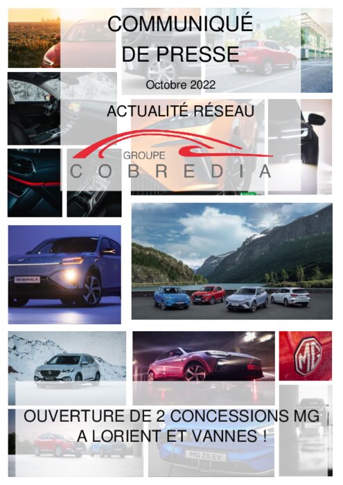 Constructeurs 03 octobre 2022 - 14:40 Le Groupe Cobredia, Compagnie Bretonne de Diffusion Automobile, annonce l’ouverture de la concession MG à Lorient le 1er octobre 2022. PDF (865 Ko) Télécharger