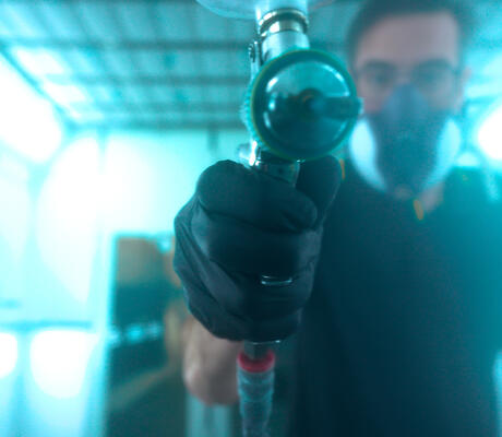 Raphaël applique la teinte en cabine de peinture sur un modèle à échelle 1