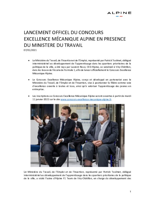 Le Ministère du Travail, de l’Emploi et de l’Insertion, représenté par Patrick Toulmet, délégué interministériel au développement de l’apprentissage dans les quartiers prioritaires de la politique de la ville, a visité l’usine d’Alpine F1 Team de Viry-Châtillon, en charge du développement des moteurs de Formule 1 ; en présence de Laurent Rossi, CEO Alpine et Cyril Dumont, Directeur de l’Établissement et des Opérations.