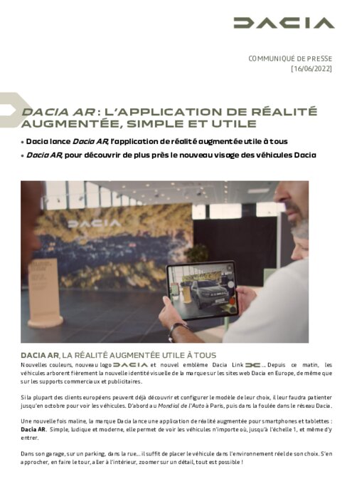 Dacia lance Dacia AR, l’application de réalité augmentée utile à tous. Dacia AR, pour découvrir de plus près le nouveau visage des véhicules Dacia. Nouvelles couleurs, nouveau logo et nouvel emblème Dacia Link. Depuis ce matin, les véhicules arborent fièrement la nouvelle identité visuelle de la marque sur les sites web Dacia en Europe, de même que sur les supports commerciaux et publicitaires.