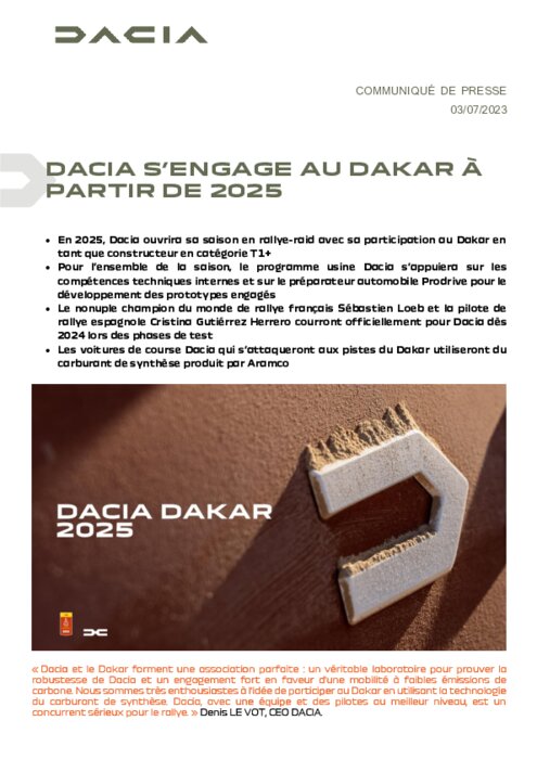La marque roumaine est chargée de continuer à développer les moteurs thermiques au sein du groupe, tandis que Renault et Alpine construisent leur gamme électrique. Des Dacia n'avaient pour l'heure disputé le Dakar qu'à titre privé.