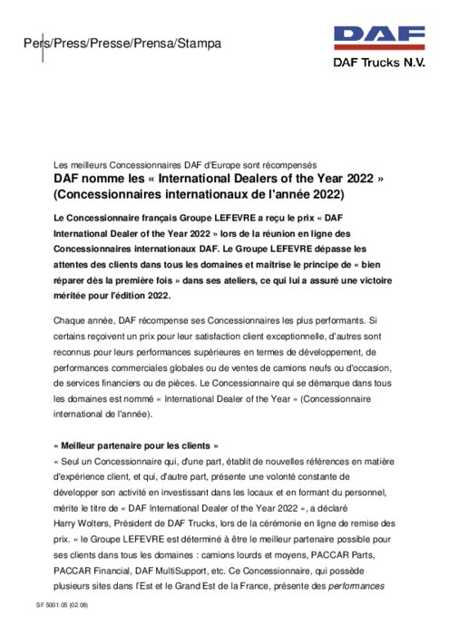 Le Concessionnaire français Groupe LEFEVRE a reçu le prix « DAF International Dealer of the Year 2022 » lors de la réunion en ligne des Concessionnaires internationaux DAF. Le Groupe LEFEVRE dépasse les attentes des clients dans tous les domaines et maîtrise le principe de « bien réparer dès la première fois » dans ses ateliers, ce qui lui a assuré une victoire méritée pour l'édition 2022.