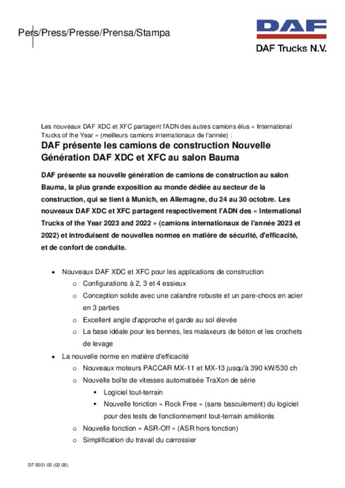 DAF présente sa nouvelle génération de camions de construction au salon Bauma, la plus grande exposition au monde dédiée au secteur de la construction, qui se tient à Munich, en Allemagne, du 24 au 30 octobre. Les nouveaux DAF XDC et XFC partagent respectivement l'ADN des « International Trucks of the Year 2023 and 2022 » (camions internationaux de l'année 2023 et 2022) et introduisent de nouvelles normes en matière de sécurité, d'efficacité, et de confort de conduite.