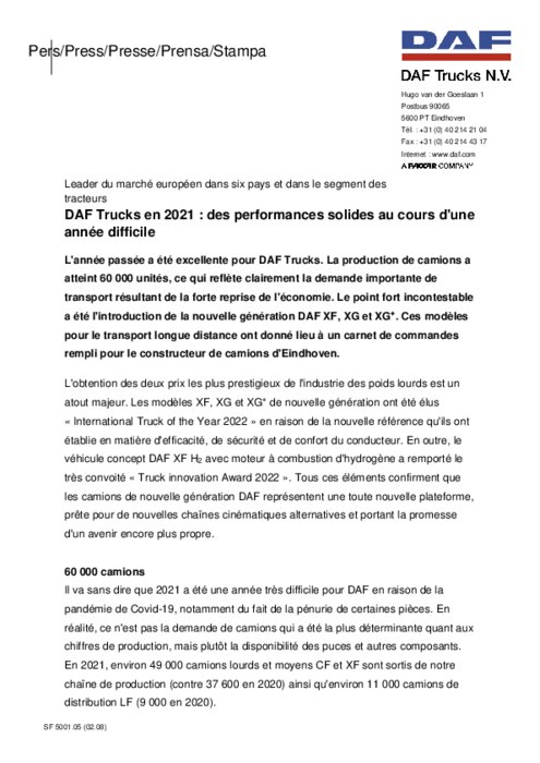 DAF Trucks en 2021 : des performances solides au cours d'une année difficile