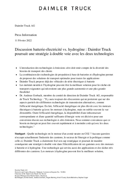 Quelle technologie est le moteur d'un avenir neutre en CO2 ? Aucune question n'occupe actuellement l'industrie des camions, le secteur de l'énergie et la politique comme celle-ci. Daimler Truck a clairement fixé son cap stratégique et poursuit de manière conséquente une stratégie à double voie dans l'électrification de ses gammes avec des moteurs à batterie et à hydrogène. Une technologie qui servira aussi des applications et des tâches très différentes des camions...