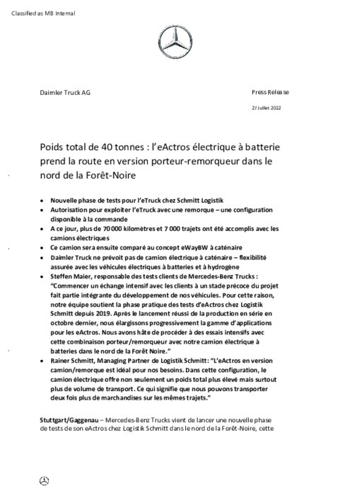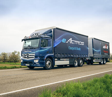 L’eActros est équipé de trois (eActros 300) ou quatre packs de batteries (eActros 400), chacune offrant une capacité installée de 112 kWh et une capacité utilisable d’environ 97 kWh. Avec quatre batteries, l’eActros 400 a une autonomie allant jusqu’à 400 kilomètres. La pièce maîtresse de ce camion est l’unité d’entraînement – un essieu électrique rigide doté de deux moteurs électriques intégrés et d’une