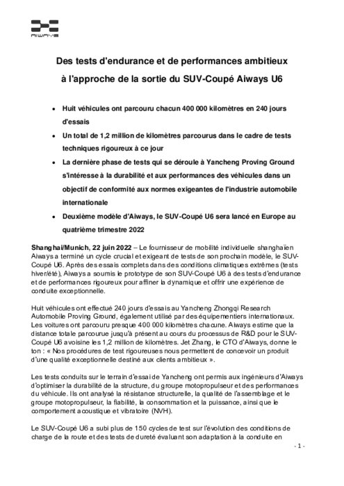 Des tests d'endurance et de performances ambitieux à l'approche de la sortie du SUV-Coupé Aiways U6