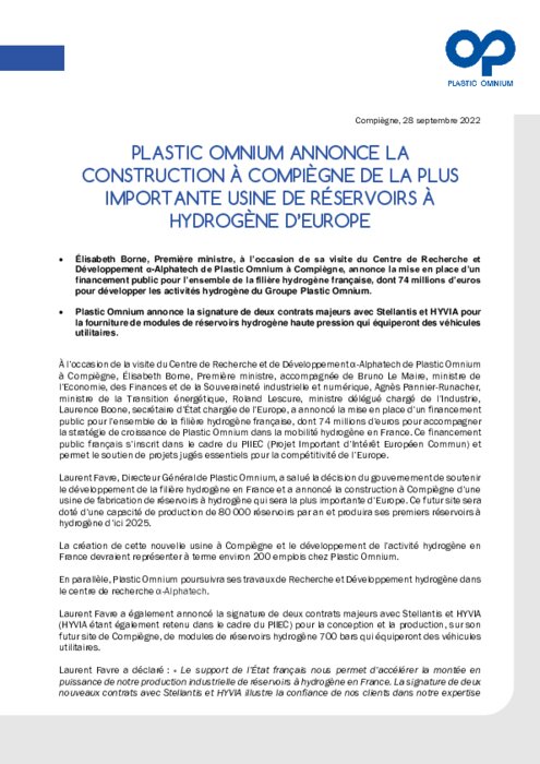 Plastic Omnium fait partie des lauréats de cette première vague de projets et va construire à cet effet, toujours à Venette, un site de production de réservoirs à hydrogène, ce qui représente 160 millions d'euros d'investissement entre 2022 et 2028 et 150 emplois.