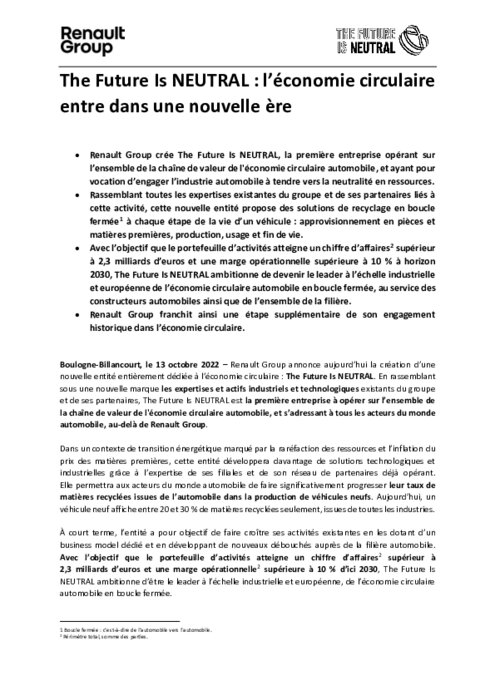 Sa filiale appelée "The future is neutral" ("le futur est neutre") ambitionne de devenir "le leader à l'échelle industrielle et européenne de l'économie circulaire automobile en boucle fermée", avec une marge opérationnelle supérieure à 10% en 2030, a indiqué Renault au cours d'une conférence de presse. Le constructeur définit "neutre" comme n'ayant besoin d'aucune nouvelle ressource ou nouveaux matériaux, et non neutre en carbone.