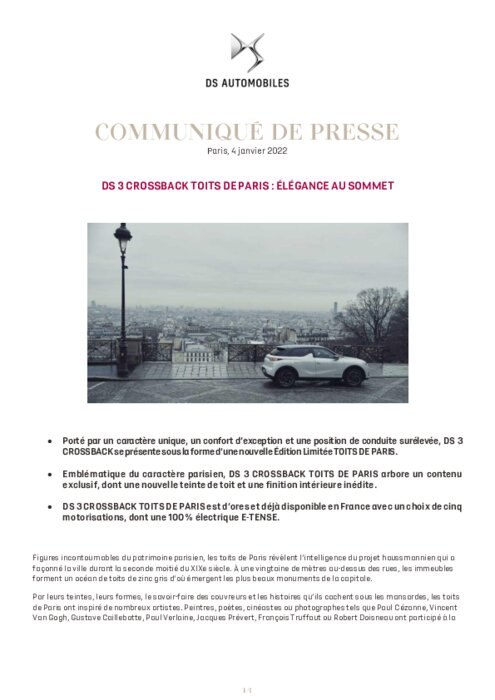 Porté par un caractère unique, un confort d’exception et une position de conduite surélevée, DS 3 CROSSBACK se présente sous la forme d’une nouvelle Édition Limitée TOITS DE PARIS. Emblématique du caractère parisien, DS 3 CROSSBACK TOITS DE PARIS arbore un contenu exclusif, dont une nouvelle teinte de toit et une finition intérieure inédite. DS 3 CROSSBACK TOITS DE PARIS est d’ores et déjà disponible en France avec un choix de cinq motorisations, dont une 100 % électrique E-TENSE...