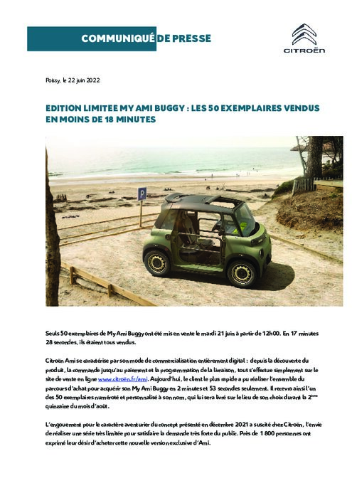 Seuls 50 exemplaires de My Ami Buggy ont été mis en vente le mardi 21 juin à partir de 12h00. En 17 minutes 28 secondes, ils étaient tous vendus. Citroën Ami se caractérise par son mode de commercialisation entièrement digital : depuis la découverte du produit, la commande jusqu’au paiement et la programmation de la livraison, tout s’effectue simplement sur le site de vente en ligne www.citroën.fr/ami.