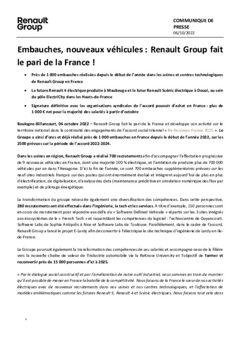 Renault Group fait le pari de la France et développe son activité sur le territoire national dans la continuité des engagements de l’accord social triennal « Re-Nouveau France 2025 ». Le Groupe a ainsi d’ores et déjà réalisé près de 1 000 embauches en France depuis le début de l’année 2022, sur les 2500 prévues sur la période de l’accord 2022-2024.
